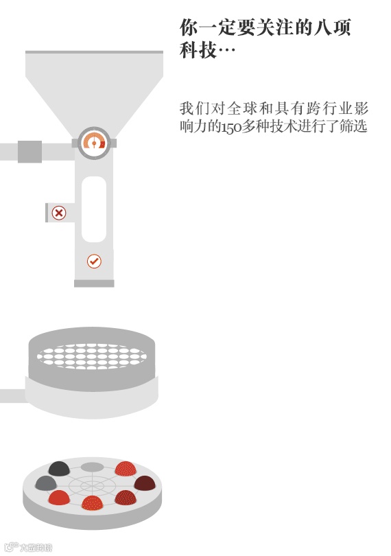 他们追踪记录了150多种独立技术,制定了一套方法来识别关联度最高的科技。他们用多元标准监测在未来五到七年内,这些技术突破所产生的业务影响力和商业可行性。