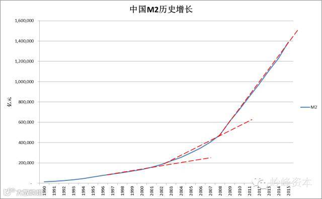 但是如果看增长率,可以大概分为三个时期:1990-2001;2002-2007;2008-2015。从图中可以看出三个阶段的M2增长斜率越来越陡峭,显示出信用扩张的速度越来越快,这也是指数增长曲线的典型特征。