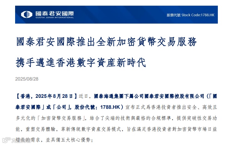 2025年6月24日,国泰君安国际控股有限公司(1788.HK)宣布旗下全资子公司国泰君安证券(香港)有限公司成功获香港证监会批准,将现有证券交易牌照升级为可提供虚拟资产交易服务。这意味着公司正式进入加密货币市场,成为首家拥有全方位虚拟资产交易能力的香港中资券商。