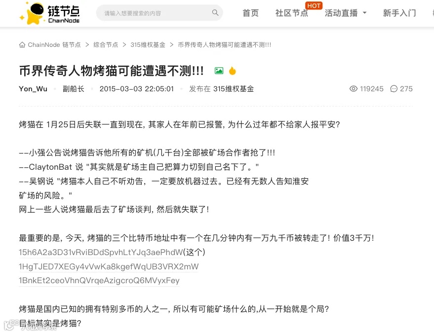 2015年3月,一网友指出,烤猫的3个比特币钱包账户在几分钟内转出可一万九千BTC。这在当时价值3千万人民币。
