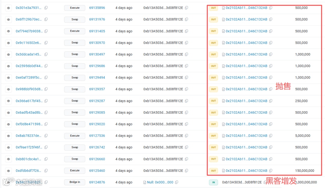 1.精算式变现:攻击者铸造了10亿枚代币,精准抽走抛售了1.6亿枚换得199.5BNB(约$16.6万)。他拿走了流动性允许的最大值,避免了滑点过高。