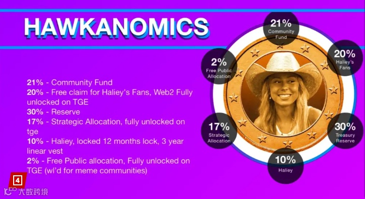 12月4日,哈利·韦尔奇和她的团队推出了HAWK代币,在Solana区块链上推出时初始价格为0.005492美元,并迅速飙升超过900%。据数据显示,HAWK代币推出后,市值攀升至接近5亿美元的高位。