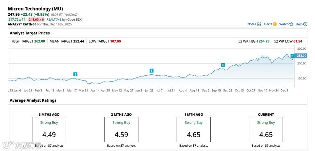 总体而言,美光科技目前获得了分析师们一致的 “强烈买入” 评级。在37位覆盖该股的分析师中,有28位推荐强烈买入,平均目标价显示仍有上涨空间,而Baird的443美元目标价则暗示了未来高达 79% 的潜在涨幅。