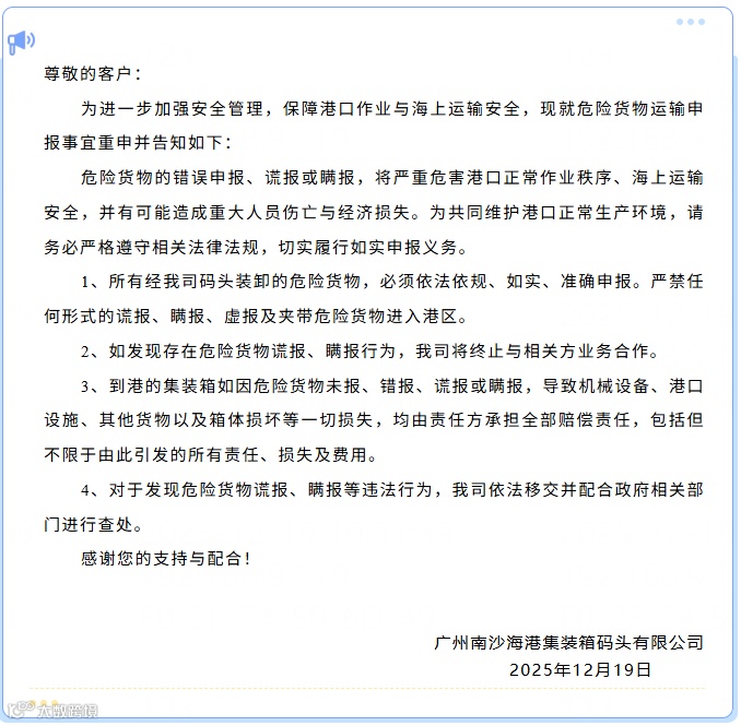 - 所有经南沙港码头装卸的危险货物,必须依法依规如实、准确申报。