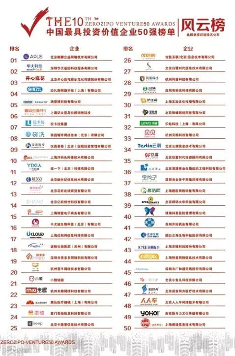 15年12月,第十届中国最具投资价值企业 “风云榜50强”颁奖典礼上发布了最具投资价值风云榜和新芽榜,经过初评和复评,近200位顶级创业投资家进行细致筛选和客观评分,米趣凭借迅猛的增长势头和不断创新的理念,从4000多家企业中脱颖而出,荣登“中国最具投资价值企业50强”风云榜。 同时上榜的还有开心麻花、饿了么、拉卡拉等。 “2015第十届中国最具投资价值企业50强”颁奖盛典由清科集团和投资界主办,已经成为每年创投界最关注的奖项之一。