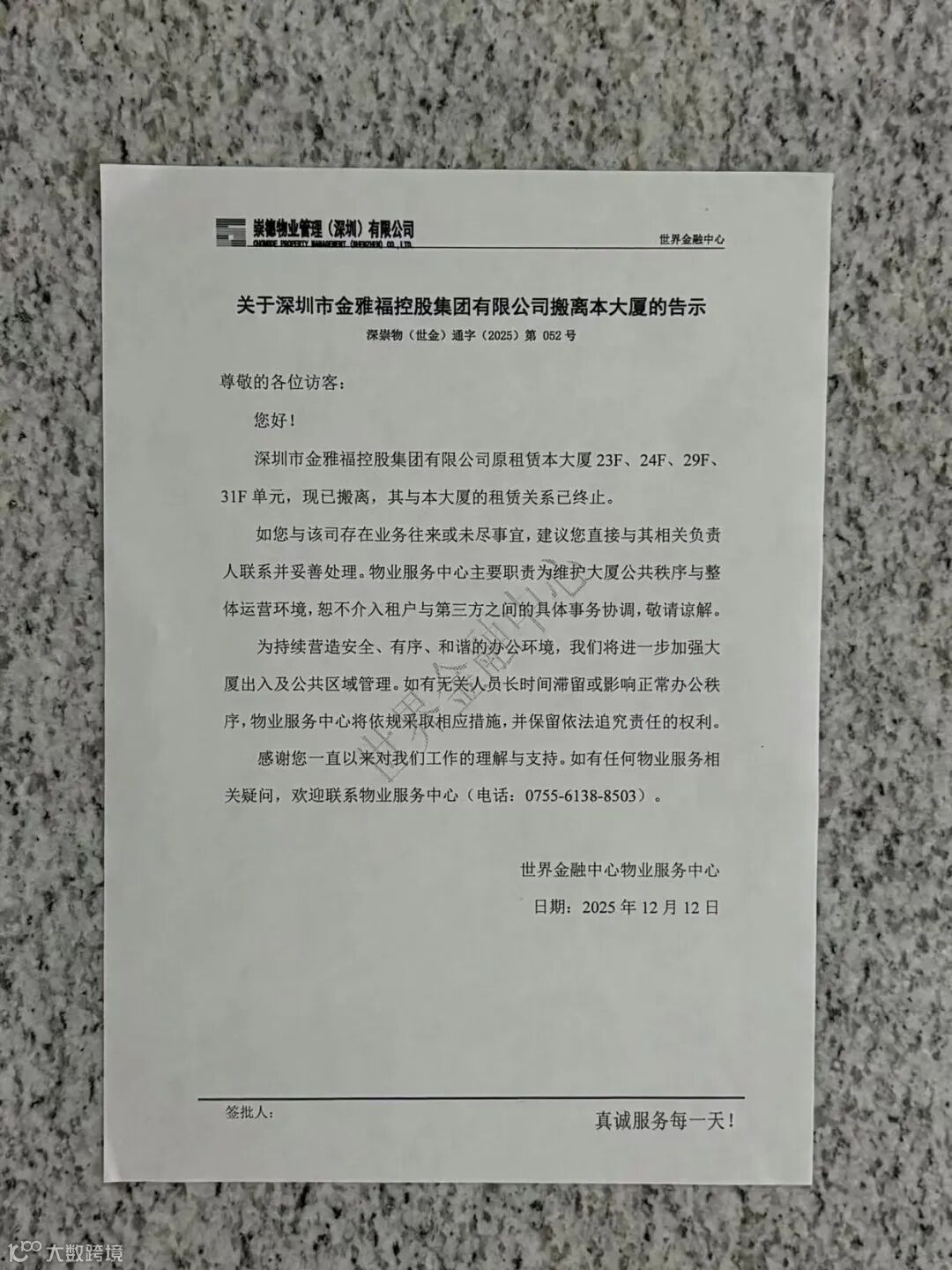 记者看到,相关楼层多处张贴有该大厦物业公司公告,称金雅福原租赁该大厦23F、24F、29F、31F单元,现已搬离,其与该大厦的租赁关系已终止。公告签发日期为2025年12月12日。