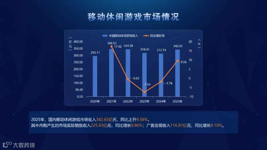 2025年,国内移动休闲游戏市场收入342.65亿元,同比上升9.56%。其中内购产生的市场实销收入225.83亿元,同比增长9.8%;广告变现收入116.81亿元,同比增长9.1%。