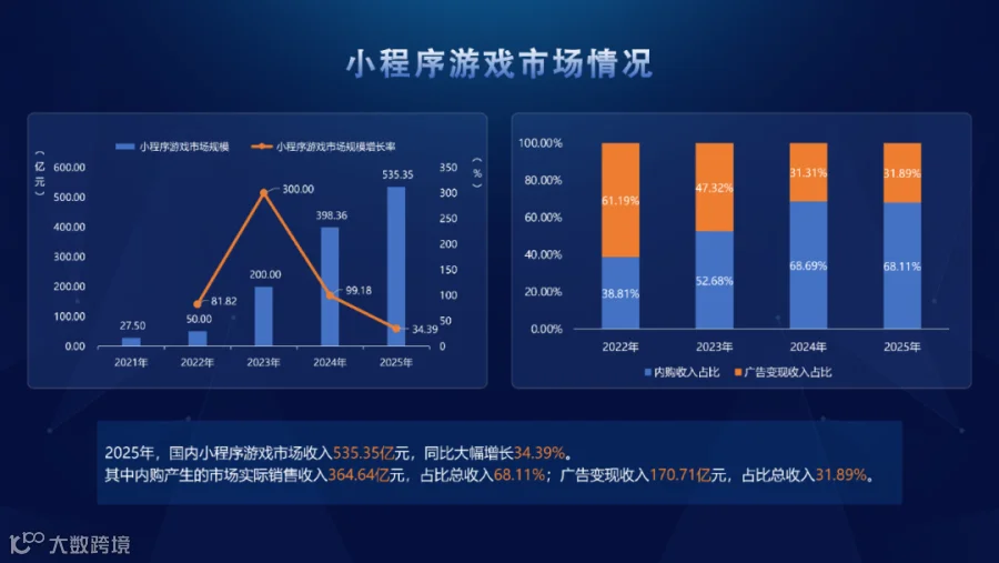 2025年,国内小程序游戏市场收入535.35亿元,同比大幅增长34.39%。其中内购产生的市场实销收入364.64亿元,占比总收入68.11%;广告变现收入170.71亿元,占比总收入31.89%。