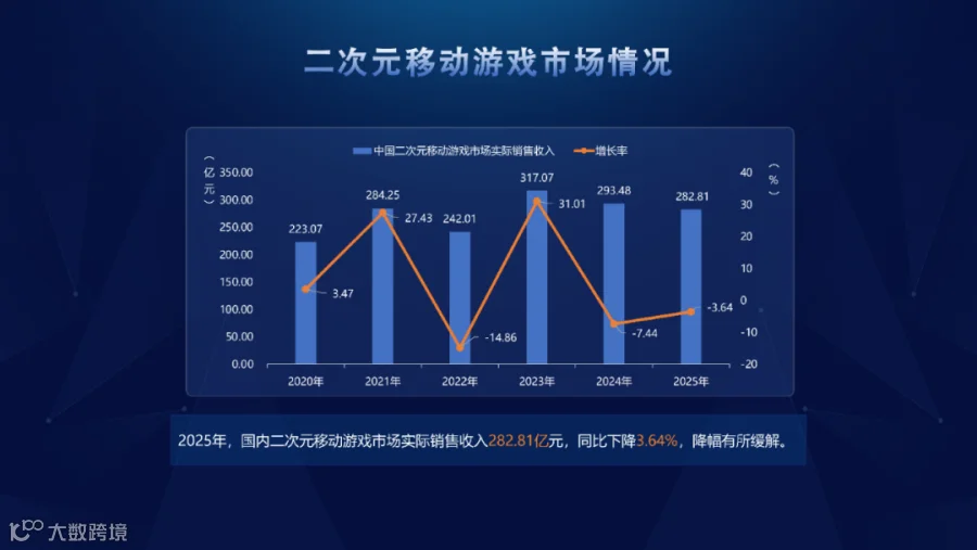 2025年,国内二次元移动游戏市场实销收入282.81亿元,同比下降3.64%,降幅有所缓解。主因有二:一是多款头部产品流水下行;二是多数新品上市表现未达预期。