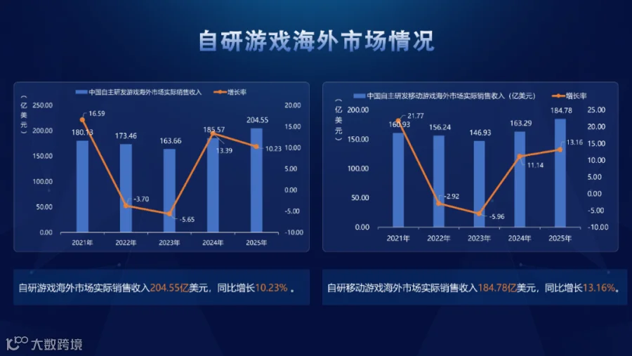 自研游戏海外市场实际销售收入204.55亿美元,同比增长10.23%,规模已连续六年超千亿元人民币。其中,自研移动游戏海外市场实际销售收入184.78亿美元,同比增长13.16%。在全球经济波动、竞争明显加剧背景下,我国游戏企业积极应对,展现出不俗实力和强劲韧性。
