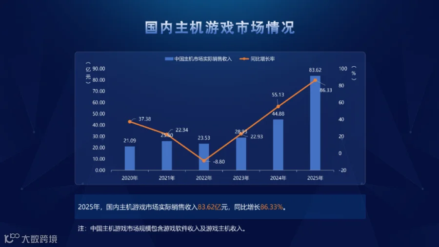 2025年,国内主机游戏市场实销收入83.62亿元,同比增长86.33%,延续了3年来的高速增长态势。