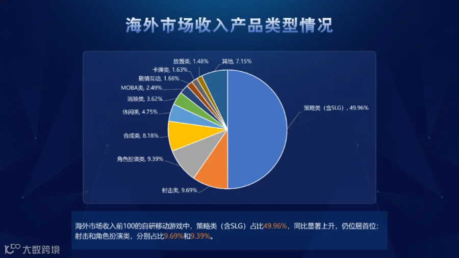 海外市场收入前100的自研移动游戏中,策略类(含SLG)占比49.96%,同比显著上升,仍居首位;射击和角色扮演类,分别占比9.69%和9.39%。在近五年的排行中,策略类一直保持着海外营收主力地位。