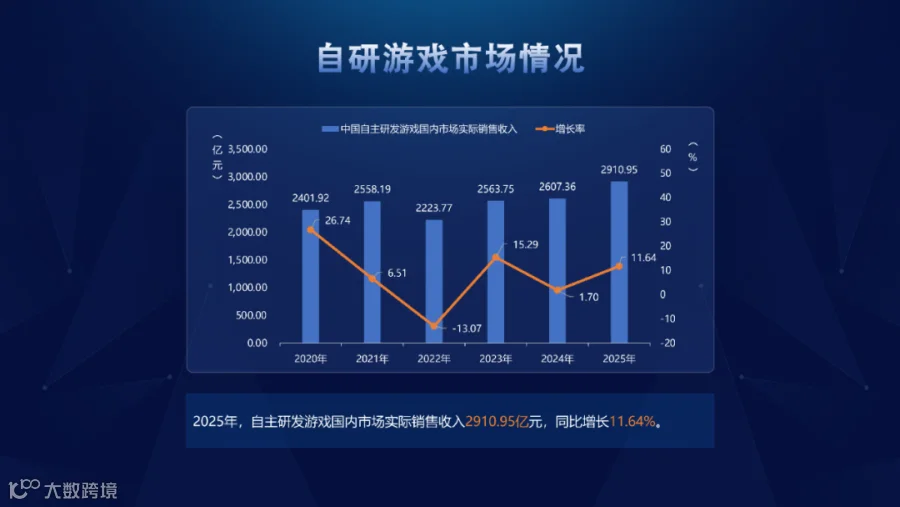 2025年,自主研发游戏国内市场实际销售收入2910.95亿元,同比增长11.64%,除得益于头部长青产品稳定支撑外,多款自研新品也带来明显增量。