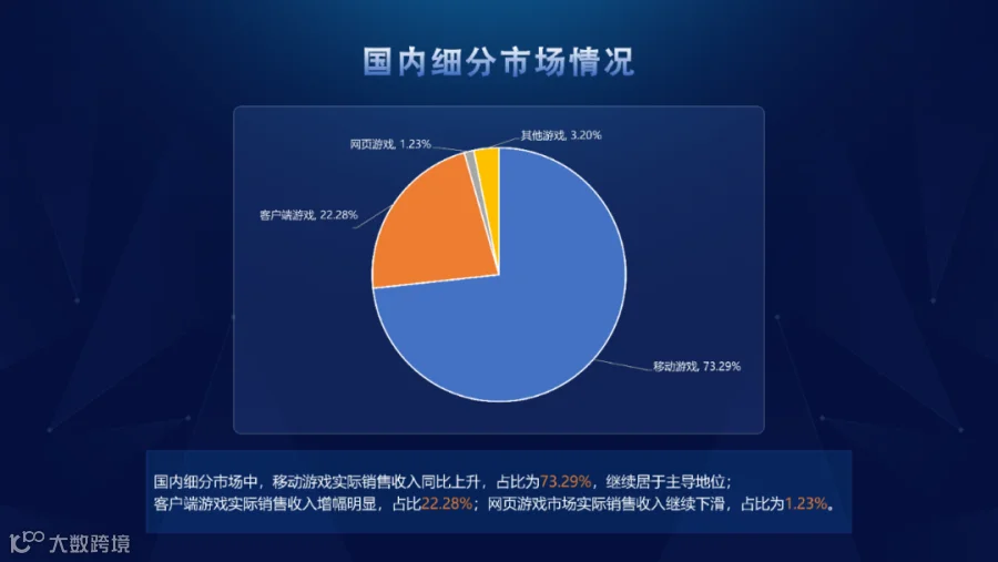 国内细分市场中,移动游戏实销收入同比上升,占比为73.29%,继续居于主导地位;客户端游戏实销收入增幅明显,占比22.28%;网页游戏市场实销收入继续下滑,占比为1.23%。