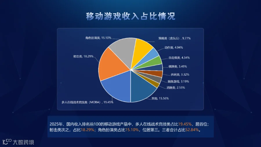 2025年,国内收入排名前100的移动游戏产品中,多人在线战术竞技类占比19.45%,居首位;射击类次之,占比18.29%;角色扮演类占比15.1%,位居第三。三者合计占比52.84%。以上数据显示,策略和卡牌类产品数量占比虽高,收入占比却并无优势。