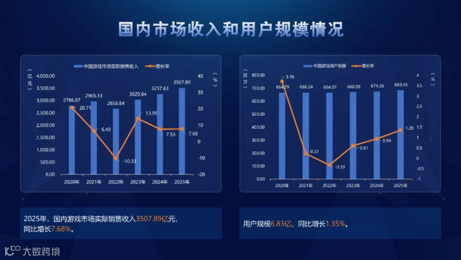 2025年,国内游戏市场实际销售收入3507.89亿元,同比增长7.68%;用户规模6.83亿,同比增长1.35%。同为历史新高点。
