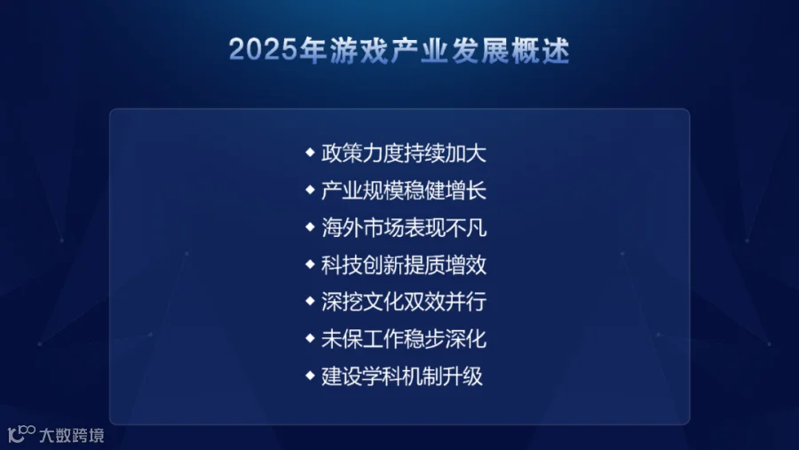 2025年,我国游戏产业发展总体情况概括如下:一是政策扶持力度持续加大,多元路径促进产业高质量发展;二是产业规模稳健增长,多维创新与长线运营并举;三是海外市场表现不凡,自研游戏影响力提升;四是科技创新提质增效,生成式人工智能应用升温;五是深度挖掘传统文化精髓,赋能经济效益与社会价值;六是未保工作力度不减,积极承担社会责任;七是游戏专业纳入高校学科体系,人才培养机制跃上新台阶。
