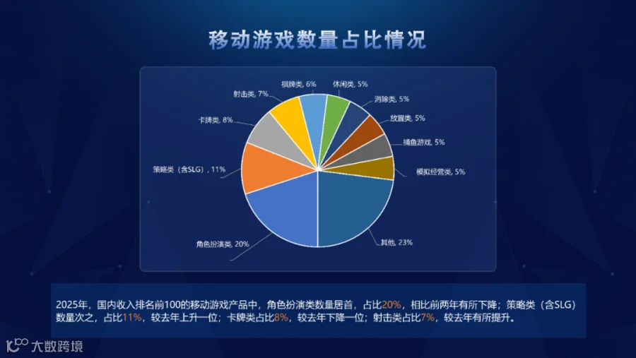 2025年,国内收入排名前100的移动游戏产品中,角色扮演类数量居首,占比20%,相比前两年有所下降;策略类(含SLG)数量次之,占比11%,较去年上升一位;卡牌类占比8%,较去年下降一位;射击类占比7%,较去年有所提升。
