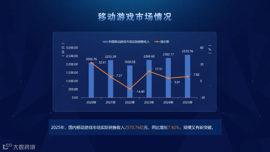 2025年,国内移动游戏市场实销收入2570.76亿元,同比增长7.92%,规模又有新突破。