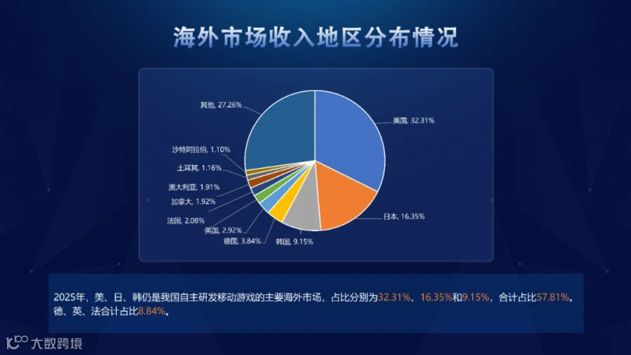 2025年,美、日、韩仍是我国自主研发移动游戏主要海外市场,占比分别为32.31%、16.35%和9.15%,合计占比57.81%。德、英、法合计占比8.84%。无论美、欧、东亚等成熟市场,还是拉美、中东等新兴市场,整体分布格局暂无明显变化。