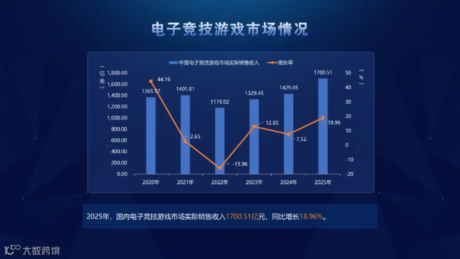2025年,国内电子竞技游戏市场实销收入1700.51亿元,同比增长18.96%。主要源于长线运营及上线电竞新品的双双发力。