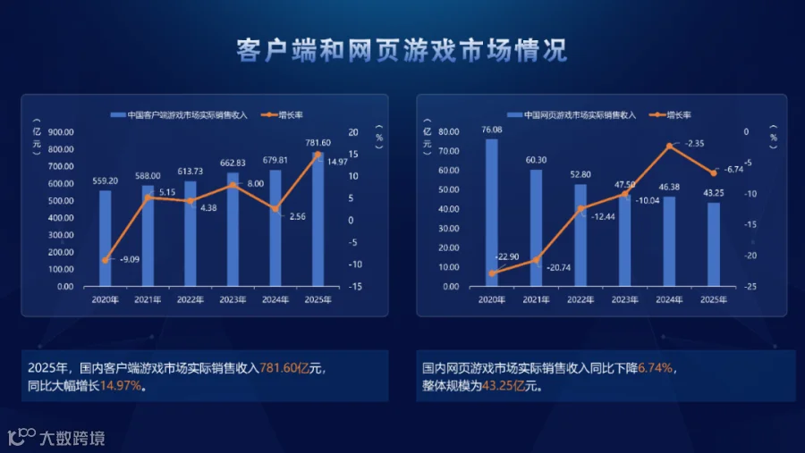 2025年,国内客户端游戏市场实销收入781.6亿元,同比大幅增长14.97%。主要得益于端游中的头部长青产品收入稳中有增,以及多款热门移动游戏新品在PC端同步发行。