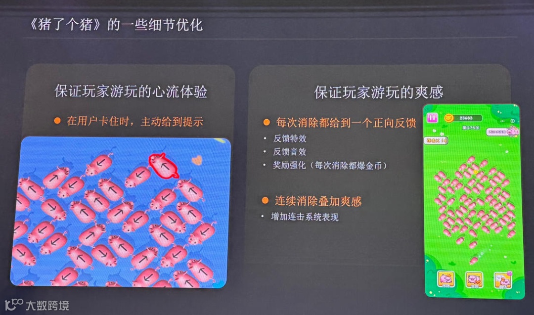 《猪了个猪》做了一些细节的优化,保证用户游玩的心流,但用户卡住的时候都会给到提示,每一次消除都会给到一个反馈,连续消除可能叠加爽感。