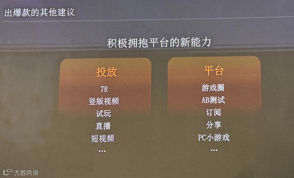 另外一个,今天讲抖音小游戏,其实就是积极拥抱平台的新功能。大家可以发现,每一次IAA游戏的爆发,其实都伴随着每个平台推出一些新的功能,比如去年推出了7R、包括试玩等等,这些新的东西必然会带来新的爆发。