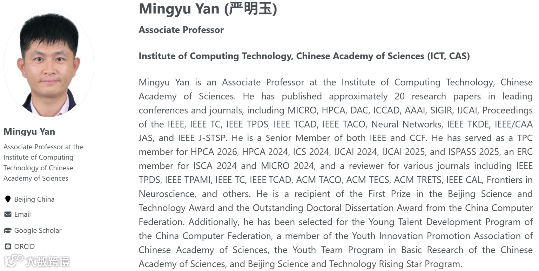 严明玉教授已在MICRO、HPCA、DAC、ICCAD、IJCAI、IEEE TC、IEEE TPDS等顶级会议与期刊发表近20篇论文,担任HPCA、ISCA、MICRO、ISPASS等会议程序委员会委员,入选中国科学院青年创新促进会、北京市科技新星计划,博士论文获CCF优秀博士论文奖 [4] 。其研究强调从系统视角解析计算负载在硬件上的执行机理,兼具理论深度与工程实践价值 [4] 。