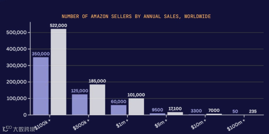 2025年,年销百万美元以上卖家从6万增至10万以上,翻近一倍;年销超1亿美元卖家从约50家增至230多家。但活跃卖家总数从240万降至180万,竞争集中度加剧。