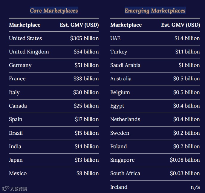 核心市场需满足:年度GMV超50亿美元且活跃卖家超1万名。新兴市场包括欧洲、亚太及中东较新或规模较小的站点,因数据不足,爱尔兰未纳入分析。