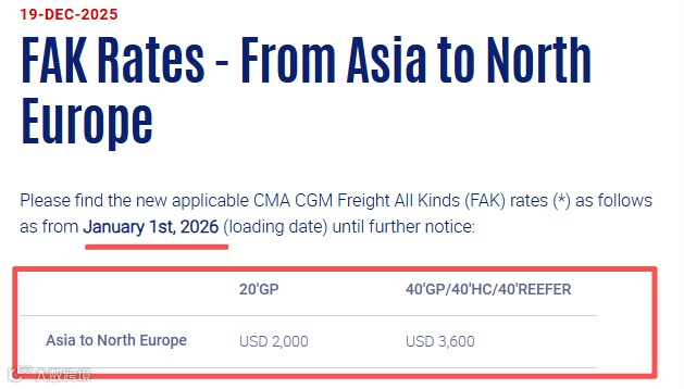 12月19日,达飞宣布,自2026年1月1日起,调整亚洲到北欧FAK费率,20尺柜2000美元,40'GP/40'HC/40'REEFER 3600美元。详情如下: