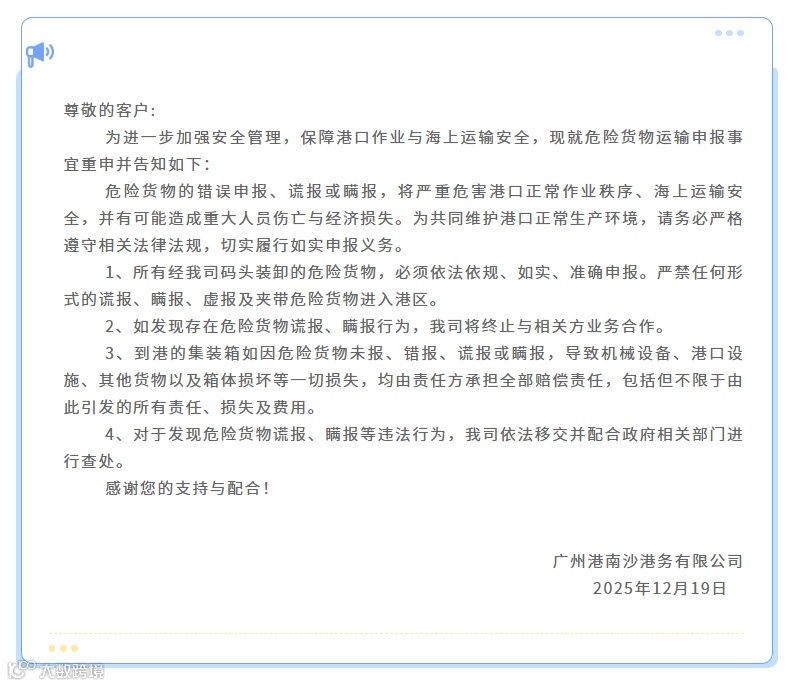 时至今日,广州南沙港再传告知书,重申严禁危险货物瞒报。