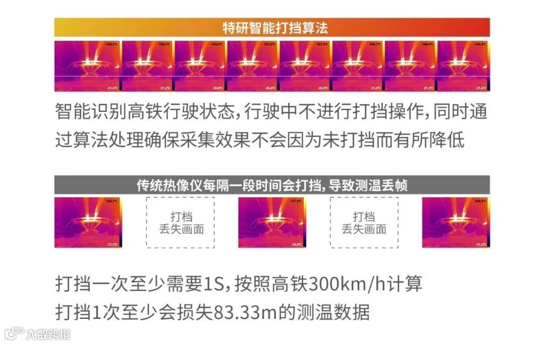 传统热像仪产品一般帧率在25hz,面对快速移动的物体,无法做到清晰聚焦成像,图像细节存在丢失、拖尾,测温误差动辄高达几十℃,高误差的测温数据无法辅助检测人员精准判断接触网、受电弓真实状态。