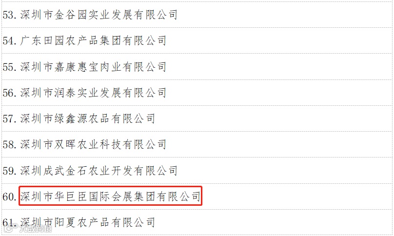 近日,广东省农业农村厅召开新闻发布会,正式公布2021年度新增国家级、省级农业龙头企业名单。其中,深圳市华巨臣国际会展集团有限公司被评选为“广东省重点农业龙头企业”,成为深圳市89家上榜企业中的一员荣登榜单!