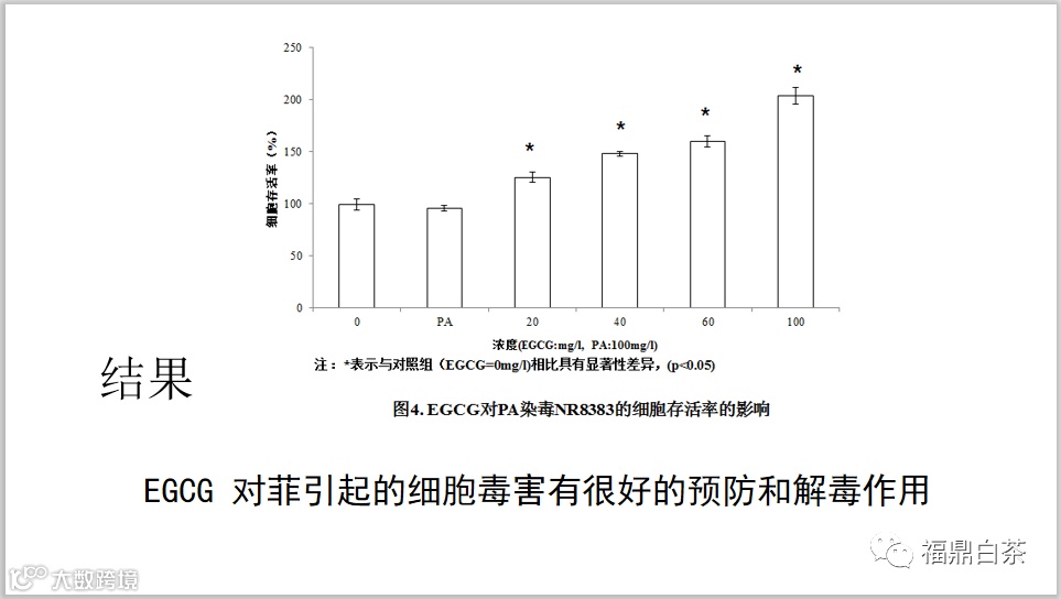 研究团队用多环芳烃染毒大鼠肺泡巨噬细胞,并加入不同浓度的EGCG来进行比较,研究发现随着添加EGCG浓度的提高,细胞的存活率也得到提升,同时,EGCG对染毒的细胞具有修复功能。由此看出,EGCG对多环芳烃引起的细胞毒害有很好的预防和解毒作用。
