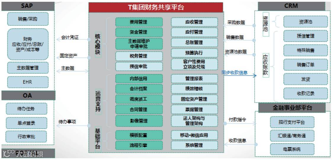 整体来看,T集团财务共享平台整个系统框架包括核心业务模块、运营支持和基础平台。