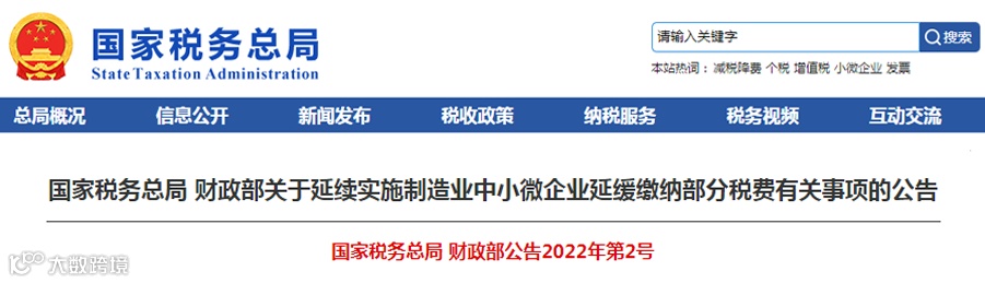 关于延续实施制造业中小微企业延缓缴纳部分税费有关事项的公告