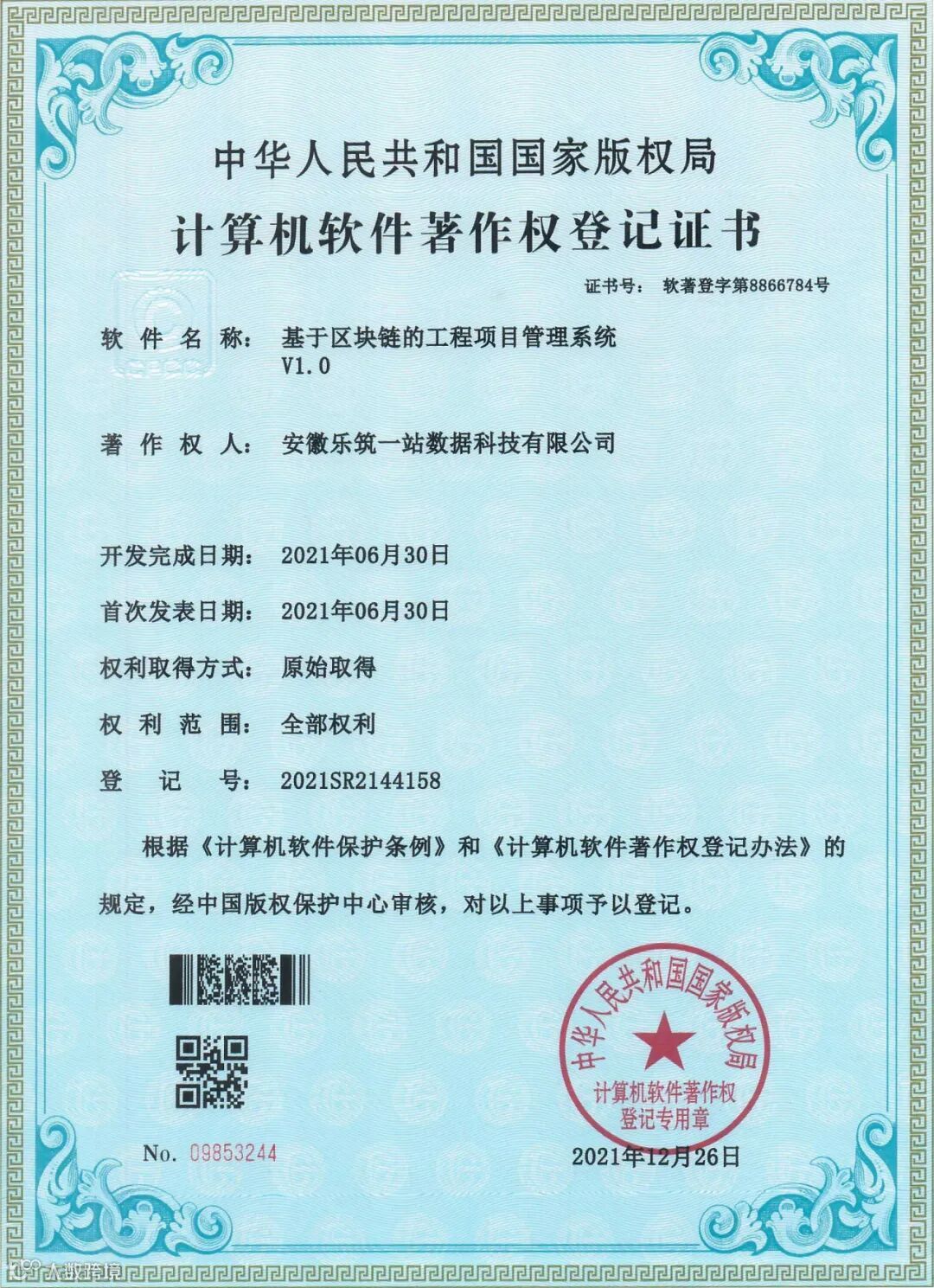 2021年,乐筑一站数据公司原始取得8项国家级软件著作权证书,截止目前原始获得共计24项。