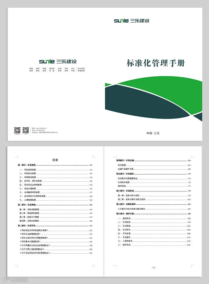 标准化:标准化、线上化、信息化、智能化是三乐建设规范化管理的递进之路,三乐建设标准化管理手册进一步得到了完善和细化,为正在实施的线上化、信息化直至智能化夯实了基础,提供了制度依据。