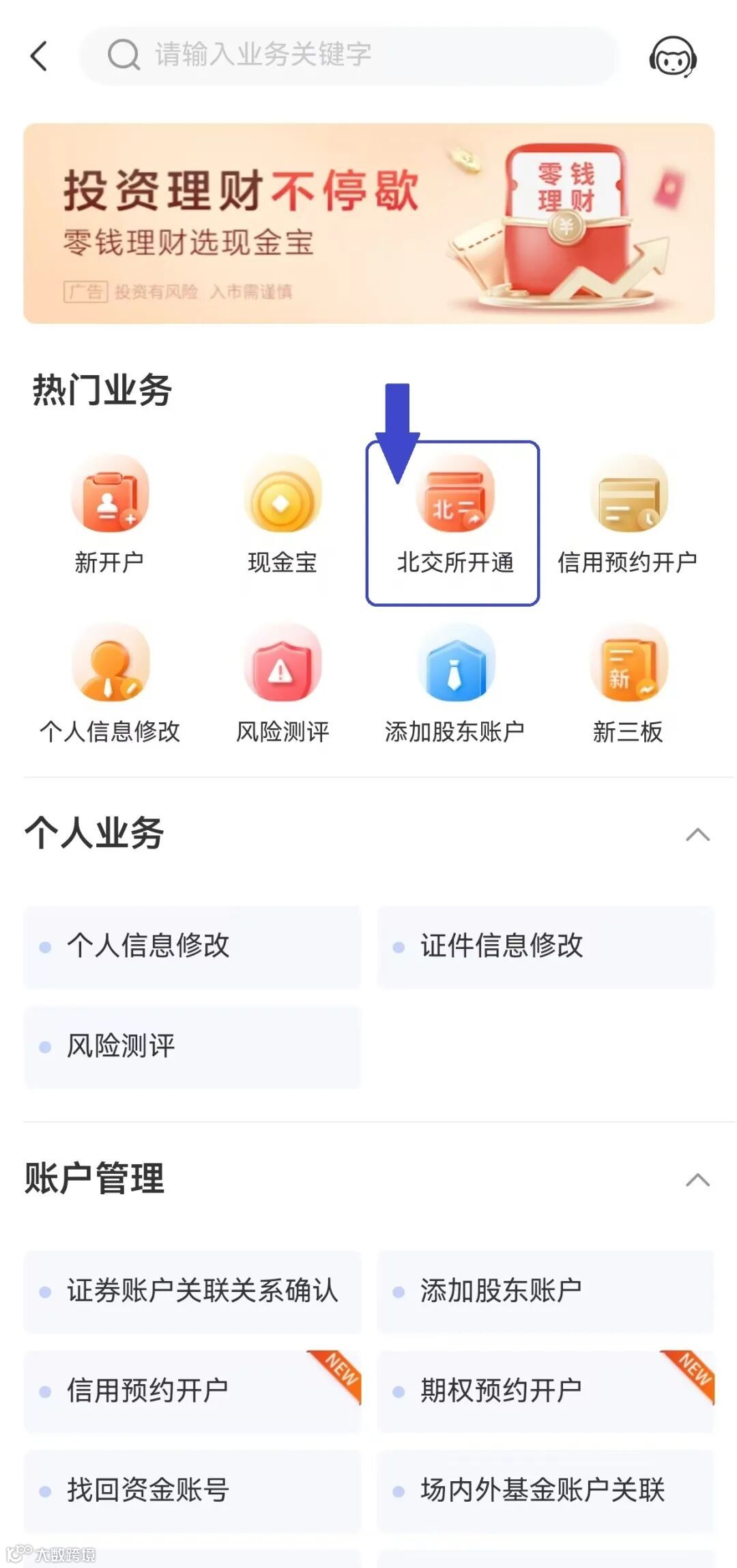 如果您满足开通条件,但还没开通科创板或北交所权限。您可以选择直接开通北交所权限。