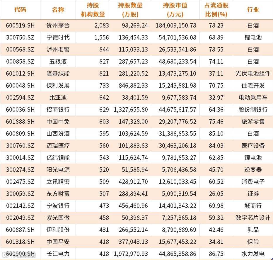 从整个机构持股来看,贵州茅台仍是持股机构数量最多的个股,其次是宁德时代。从新进出家数来看,欧晶科技、紫燕食品、华宝新能、海光信息、联影医疗居前五,分别被153家、119家、110家、94家、91家机构增持。