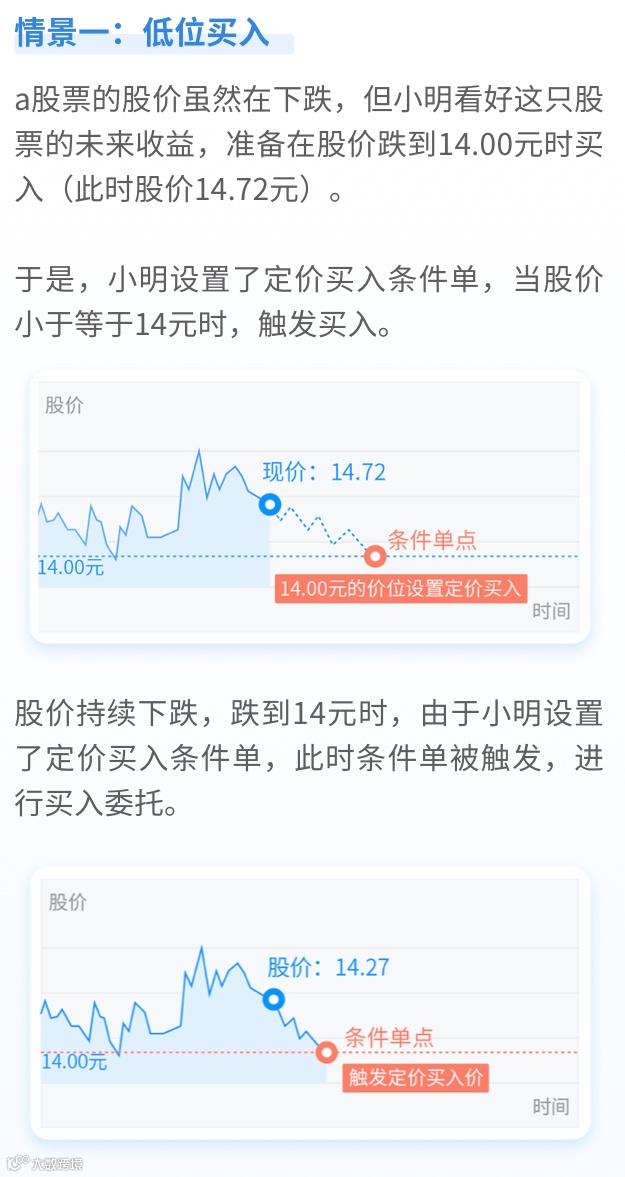1)普通委托挂单只能在交易时间内进行而定价买入条件单没有这个限制。一个条件单的最长截止日期可以设置为半年,在有效期内被触发后才会失效。