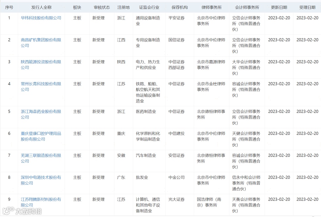 截止2月20日,根据沪深交易所官网披露,已有16家主板在审企业的首发申请获受理,其中,深交所9家,包括陕能股份、海森药业、登康口腔、华纬科技、南矿集团等;上交所7家,包括江盐集团、中信金属、中重科技等。