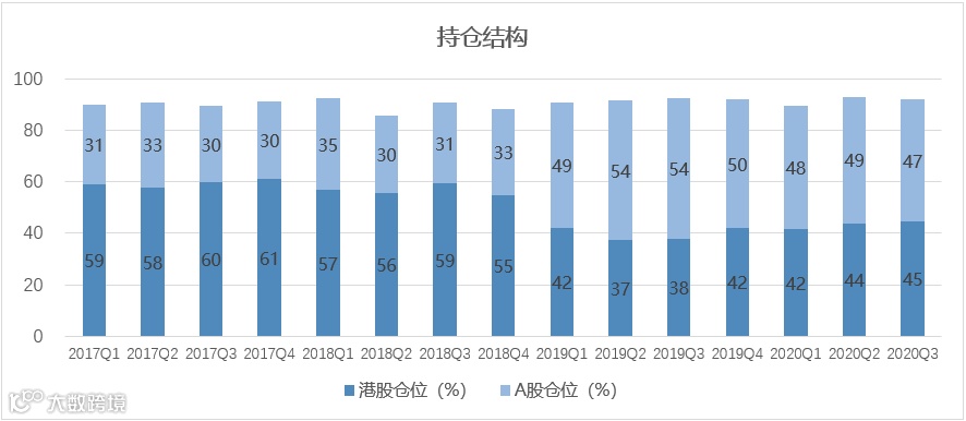 基金在港股、A上进行了较为均衡的配置,两者的配置比例都围绕45%的中枢进行波动,2020Q3的港股配置比例约45%、A股的配置比例约47%。