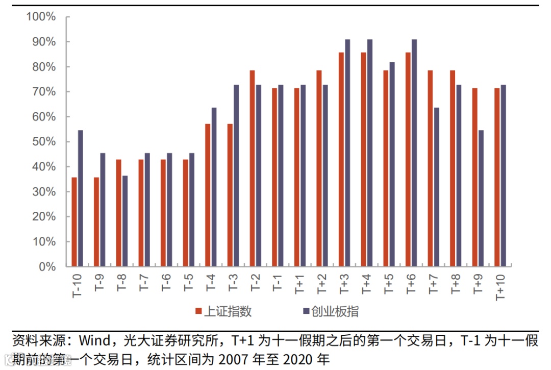 从历史上看,十一假期之后A股多有不错表现,节后开门红的概率在71.4%,节后五个交易日上涨的概率在78.6%左右,平均涨幅达到1.8%,节后上涨概率和平均表现均好于节前。