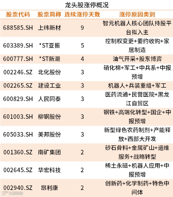 涨停的股票中,上纬新材连续9天涨停,公司涉及的概念为智元机器人核心团队持股平台拟入主。*ST亚振紧随其后,公司连续5天涨停,所属概念为控制权变更+要约收购+家居制造。*ST新潮涨停天数为4天,公司属于油气开采+股东博弈概念。北化股份、建设工业、人民同泰等个股携手涨停,以上个股引领市场上行。