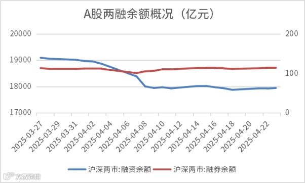 截至04月23日,两市融资余额为17945.00亿元,较前一交易日变动幅度为0.11%;融券余额为113.50亿元,较之前变动幅度为-0.72%。