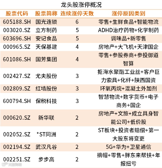 涨停的股票中,国光连锁连续6天涨停,公司涉及的概念为零售+生鲜食品+智能物流。立方制药紧随其后,公司连续5天涨停,所属概念为ADHD治疗药物+化学制药。安记食品涨停天数为5天,公司属于调味品+新零售概念。天保基建、国芳集团、尤夫股份等个股携手涨停,以上个股引领市场上行。