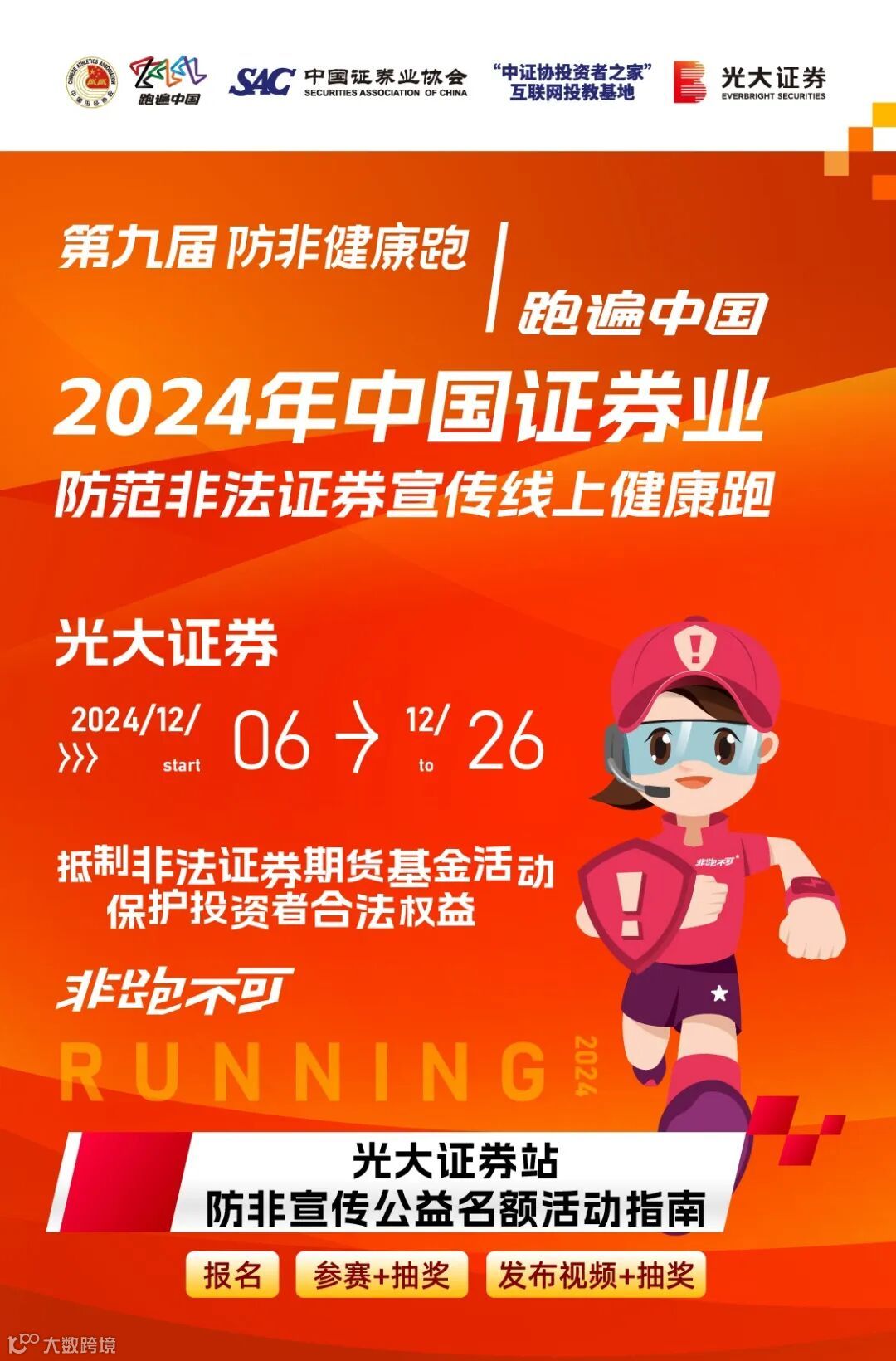 12月6日,由中国证券业协会携手中国田径协会、“中证协投资者之家”互联网投教基地、上海市证券同业公会、光大证券联合举办的“2024年中国证券业防非宣传健康跑·光大证券站”(简称“防非跑”)活力开启。本次活动以“抵制非法证券期货基金活动,保护投资者合法权益”为主题,旨在进一步加强防范打击非法金融活动、治理金融领域非法中介的工作力度,更有效地保护投资者,特别是中小投资者的合法权益。